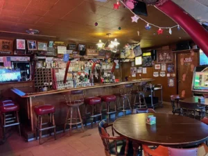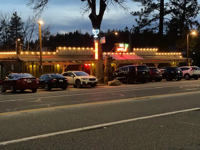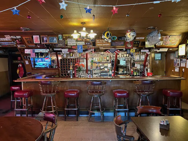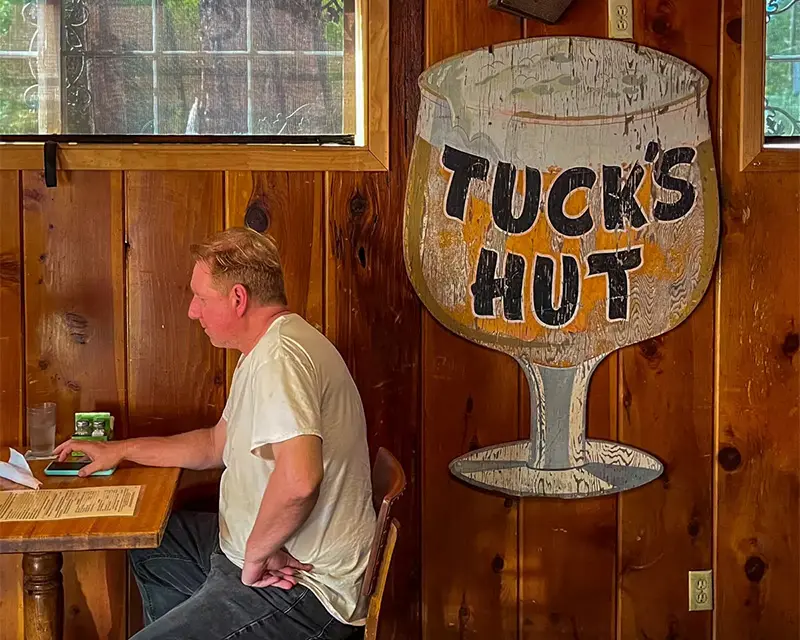 Indoors, there’s a bar side and a dining side, and in the dining room, steak is the clear favorite. While choosing, you can read the joint’s history. First it was Bill Davis’ Hut, then Wilma’s Hut, then Tuck’s Hut. Over time, as the menu grew to include burgers and then steaks, the building grew too.